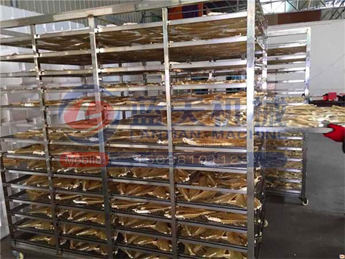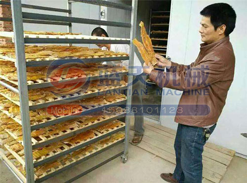把處理過的竹筍均勻有序的擺放在不銹鋼托盤上,把推車推入烘干房內(nèi),在烘干的過程中,溫度控制在45-60度,烘干時間為48個小時,直至竹筍呈金黃色就表示烘干完成,鮮筍的水份含量較大,通過壓制在烘干,時間會縮短不少。